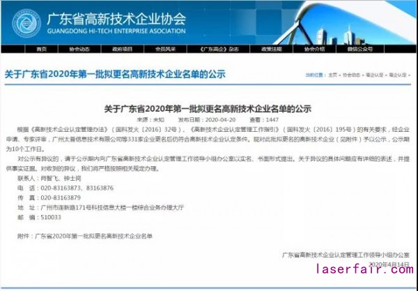 全國高新技術企業(ye) 認定管理工作領導小組辦公室2020年12月1日在廣東(dong) 省科學技術廳官網關(guan) 於(yu) 公示廣東(dong) 省2020年第一批擬認定高新技術企業(ye) 名單的通知:根據《高新技術企業(ye) 認定管理辦法》(國科發火〔2016〕32號)和《高新技術企業(ye) 認定管理工作指引》(國科發火〔2016〕195號)有關(guan) 規定,現將廣東(dong) 省2020年第一批3507家企業(ye) 擬認定高新技術企業(ye) 名單(詳見附件)予以公示;公示信息中序號“230-東(dong) 莞德爾激光科技有限公司”,不負眾(zhong) 望,這是我們(men) 再次在自主研發,隻做創新的有力見證。
