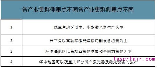 在產(chan) 業(ye) 集群方麵,目前我國初步形成了珠三角、長三角、環渤海和華中四大激光產(chan) 業(ye) 集群,從(cong) 地區來看,華中地區、華南地區和華北地區市場占比較高,三者之和為(wei) 75%。同時激光設備行業(ye) 龐大且應用廣泛,基本形成了激光晶體(ti) 、關(guan) 鍵元器件、配套件、激光器、激光係統、應用開發、公共服務平台的產(chan) 業(ye) 鏈。