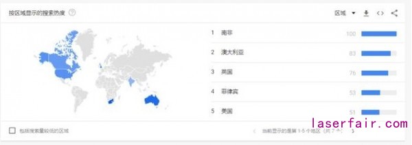 首先我們(men) 來看看穀歌趨勢中,激光切割機關(guan) 鍵詞的搜索熱度及地區分布情況。