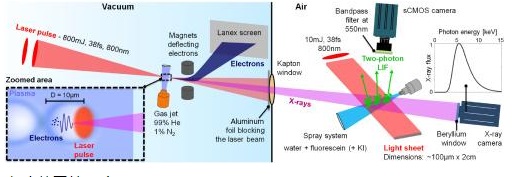 在激光-等離子體(ti) 加速器中,X射線的產(chan) 生是通過聚焦的強烈的飛秒激光脈衝(chong) 進入到氣體(ti) 或者預製等離子體(ti) 中實現的。研究人員同時使用這些飛秒激光脈衝(chong) 來實現雙光子熒光影像。