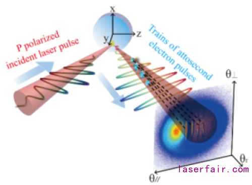 圖3.“全光阿秒電子示波器”概念圖。“全光阿秒電子示波器”概念(圖3)中“偏壓”電場場強1012V/m,瞬時掃描速度可達60 μrad/as,而其時間分辨率高達阿秒量級。該研究驗證了“全光阿秒電子示波器”的可行性,實現對自由電子脈衝(chong) 序列阿秒動力學的直接探測,為(wei) 未來實現全光阿秒電子度量提供了重要參考。