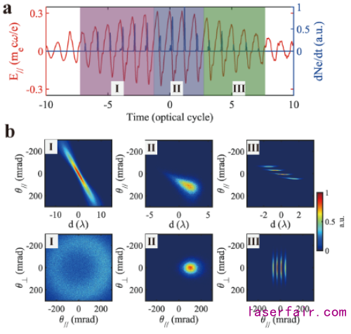 圖2.電子在光場下相位分布圖(a)與(yu) 電子空間分布圖(b)。圖2展示了不同空間分布電子在光場相位下分布及空間分布。周期性發射的阿秒電子脈衝(chong) 在激光場調製下形成了條紋結構分布,這一作用過程把電子按時間的先後順序轉換成了空間投影,根據電子空間分布可直接反演其阿秒時間動力學過程。