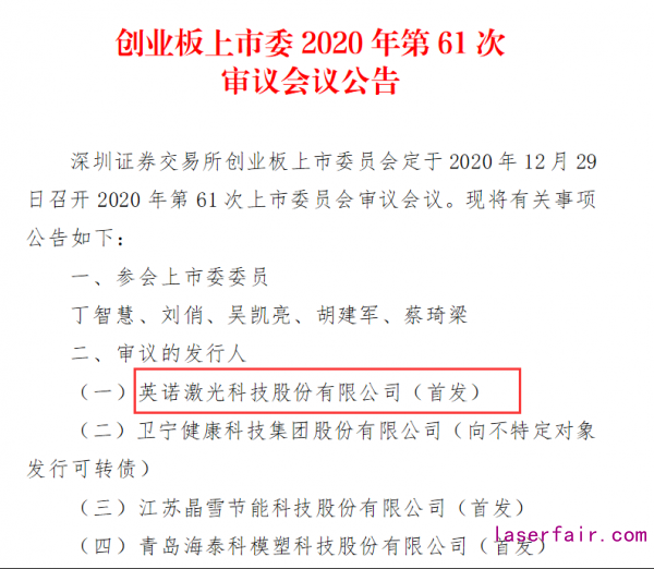 創業(ye) 板上市委公告,英諾激光科技股份有限公司(以下簡稱“英諾激光”)首發12月29日上會(hui) 。國內(nei) 領先的專(zhuan) 注於(yu) 微加工領域的激光器生產(chan) 商和解決(jue) 方案提供商英諾激光於(yu) 2020年9月29日再次向深交所創業(ye) 板遞交招股書(shu) 。據悉,這是英諾激光繼2019年6月28日、2019年12月20日和2020年6月24日之後,第四次提交資料衝(chong) 擊IPO。