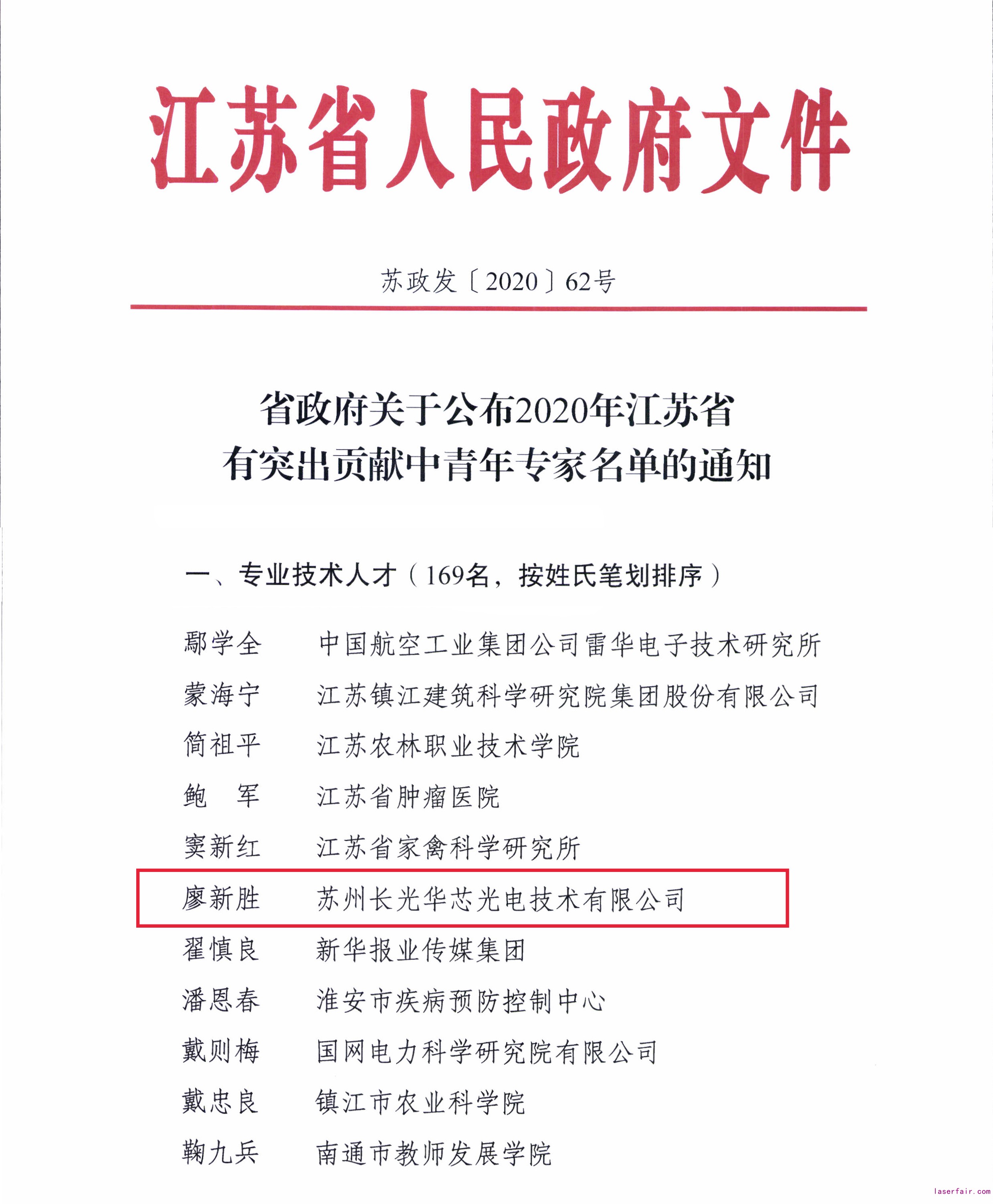近日,江蘇省人民政府公布2020年江蘇省有突出貢獻中青年專(zhuan) 家名單,長光華芯副總經理廖新勝博士以專(zhuan) 業(ye) 技術人才身份入選。