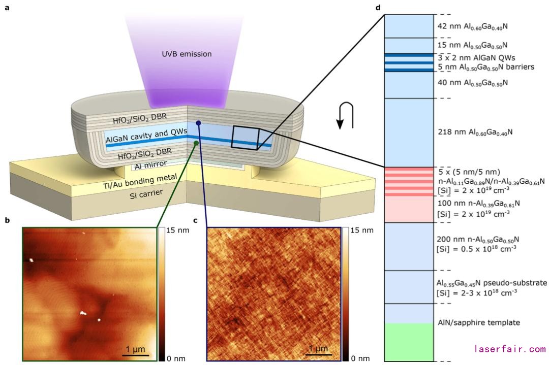 然而,目前報道的紫外線VCSEL因GaN的能隙限製(360nm)而全部集中在UVA(320-400 nm)這個(ge) 範圍內(nei) 。為(wei) 了實現大多數應用場景所需的UVB(280-320 nm)和UVC(200-280 nm)中波段的紫外線發射,激光介質必須由AlGaN製成,這是這項工作的主要挑戰。