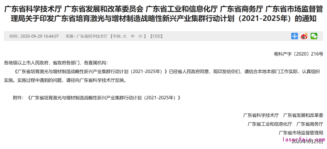 2020年9月,廣東(dong) 省科技廳牽頭省發改委、工信廳等5部門編製印發了《廣東(dong) 省培育激光與(yu) 增材製造戰略性新興(xing) 產(chan) 業(ye) 集群行動計劃(2021-2025年)》)(以下簡稱《行動計劃》)。“激光與(yu) 增材製造”產(chan) 業(ye) 成為(wei) 廣東(dong) 省重點培育發展的十大戰略性新興(xing) 產(chan) 業(ye) 集群之一。對於(yu) 廣東(dong) 的激光與(yu) 增材製造產(chan) 業(ye) 來說,這也是行業(ye) 首次迎來省級的專(zhuan) 題支持政策。