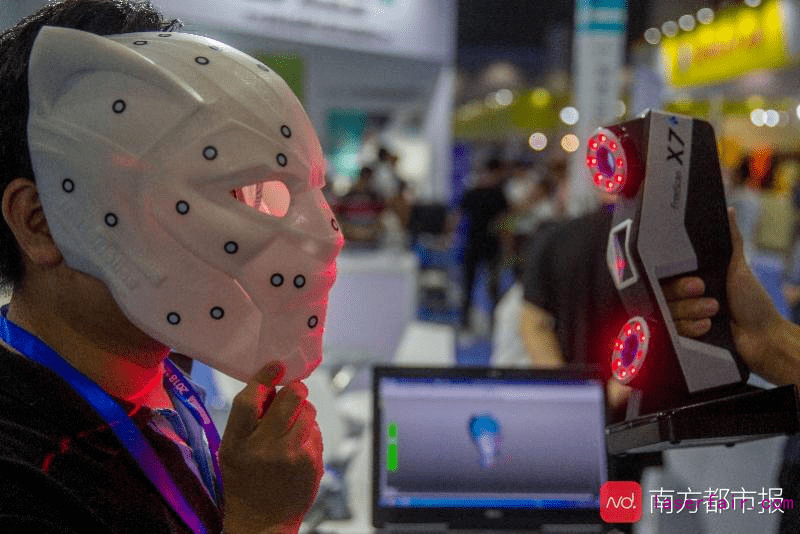 2018年廣州3D打印展上,瞬間掃描後即可複製黑豹麵具。南都記者 譚慶駒 攝