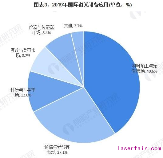 國際激光設備應用較為(wei) 多元化,包括材料加工與(yu) 光刻市場、通信與(yu) 光儲(chu) 存市場、科研與(yu) 軍(jun) 事市場、醫療與(yu) 美容市場、儀(yi) 器與(yu) 傳(chuan) 感器市場等,其中,材料加工與(yu) 光刻市場占比最高,達40.6%;其次為(wei) 通信與(yu) 光儲(chu) 存市場,占比為(wei) 27.1%。