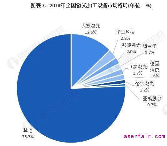 全國激光加工設備市場格局較為(wei) 分散,全國激光加工設備TOP8占比僅(jin) 為(wei) 24.3%,市場集中度較低,排名首位的大族激光市占率也僅(jin) 為(wei) 12.6%,但是高於(yu) 占比排名第二位的華工科技(占有率僅(jin) 為(wei) 2.8%)約10個(ge) 百分比,呈現斷崖式領先。