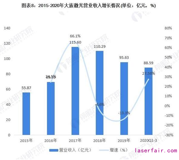 在激光加工設備領域,大族激光公司成為(wei) 行業(ye) 內(nei) 唯一入選國家工信部智能製造試點示範項目名單的企業(ye) ,競爭(zheng) 力較強,業(ye) 績增長明顯,2020年前三季度公司營業(ye) 收入達88.59億(yi) 元,同比增長27.58%。