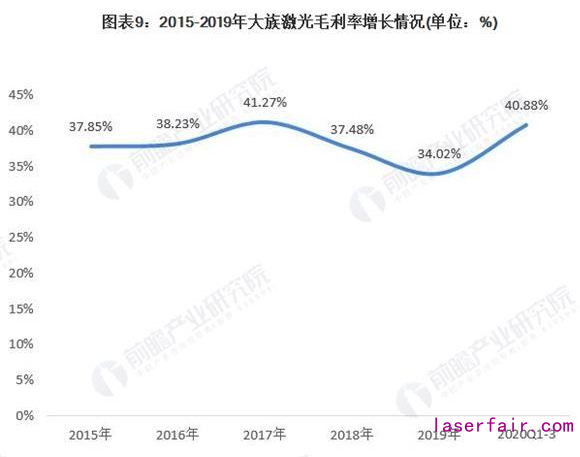 2015-2019年大族激光毛利率整體(ti) 在35%以上水平,2019年略有下降,主要是受產(chan) 品銷售結構及市場競爭(zheng) 加劇的影響,導致公司綜合毛利率較2018年度下降約3.46個(ge) 百分點;但是2020年前三季度上升為(wei) 40.88%。