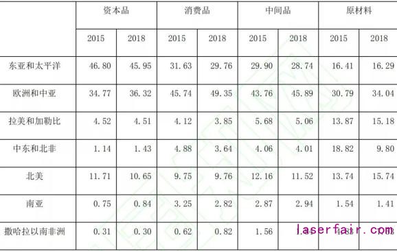 從(cong) 不同類型產(chan) 品出口的地區分布變化來看,東(dong) 亞(ya) 和太平洋地區、歐洲和中亞(ya) 是製成品(包括資本品、消費品和中間品)最主要的出口地區,其次為(wei) 北美,而原材料出口的地區分布相對比較平均,最高的歐洲和中亞(ya) 占比在30%以上,東(dong) 亞(ya) 和太平洋、拉美和加勒比、北美均在10%以上。2015-2018年間,東(dong) 亞(ya) 和太平洋地區的資本品、消費品、中間品和原材料出口占世界比重均有所下降,而歐洲和中亞(ya) 地區上述四類產(chan) 品占世界比重均有明顯提高。拉美和加勒比地區、北美地區、撒哈拉以南非洲地區原材料出口占比分別提高1.31、2和2.7個(ge) 百分點。
