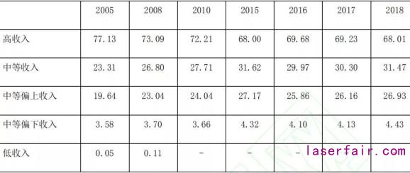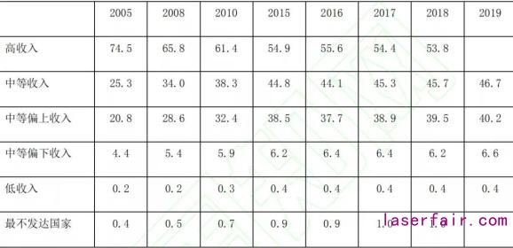 從(cong) 表1可以看到,2005年,不同收入水平國家製造業(ye) 增加值占世界的比重分別為(wei) :高收入國家占74.5%,中等收入國家占25.3%,其中中等偏上收入國家占20.8%,中等偏下收入國家占4.4%,低收入國家的工業(ye) 化水平極低,製造業(ye) 增加值僅(jin) 占全球的0.2%。