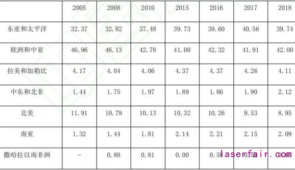 製造業(ye) 在不同收入水平和不同區域的分布狀況變化反映了各國製造業(ye) 競爭(zheng) 優(you) 勢的變化,而這一點又在各區域和國家的全球出口份額上表現出來。