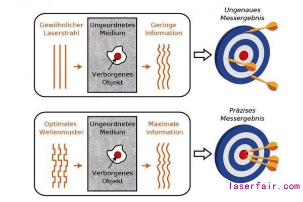 技術維也納技術大學的斯泰凡·羅特(Stefan Rotter)表示:“你一直想獲得盡可能最佳的測量精度(這是所有自然科學的核心要素)。讓我們(men) 思考一下,例如,目前正用於(yu) 檢測引力波的巨大 LIGO 設施。在這個(ge) 設施中,你將激光束發射到鏡子上,並以極高的精度測量激光與(yu) 鏡子之間的距離變化。”因為(wei) 激光束是通過超高真空發送的,所以效果才能很好。任何幹擾,無論有多小,都需要避免。但是,當你麵對無法消除的幹擾時,該怎麽(me) 辦?烏(wu) 特勒支大學的阿爾拉德·莫斯克(Allard Mosk)表示:“讓我們(men) 想象一下,一塊玻璃板不是完全透明的,而是像浴室窗戶那樣粗糙。光可以穿過,但不能成為(wei) 一條直線。光波會(hui) 發生變化和散射,所以我們(men) 無法用肉眼準確地看到窗戶另一側(ce) 的物體(ti) 。” 這個(ge) 情況與(yu) 檢查生物組織內(nei) 的微小物體(ti) 非常相似:雜亂(luan) 的環境會(hui) 幹擾光束。簡單、規則、筆直的激光束就變成了複雜的波形,向各個(ge) 方向偏轉。可是,如果你確切地知道幹擾環境會(hui) 對光束造成什麽(me) 影響,則可以逆轉這種情況:然後有可能創造出一種複雜的波形,而不是簡單、筆直的激光束,該激光束可以根據受到的幹擾和撞擊轉化為(wei) 所需的形狀,從(cong) 而帶來最佳的效果。這項研究的第一作者多裏安·布歇特(Dorian Bouchet)解釋說:“要實現這一目標,你甚至不需要確切地知道幹擾是什麽(me) 。首先通過係統發送一組試驗波,就足以研究它們(men) 是如何被係統所改變的。”下圖所示:這個(ge) 最優(you) 方案在入射激光束上印刻一個(ge) 圖案,從(cong) 而在物體(ti) 上產(chan) 生最大的信息輸出,使我們(men) 可以精確地測量物體(ti) 的位置(見底部圖像),而不是采用筆直的普通激光束來評估在一個(ge) 混亂(luan) 環境內(nei) 隱藏的物體(ti) 的位置。(見頂部圖像)。