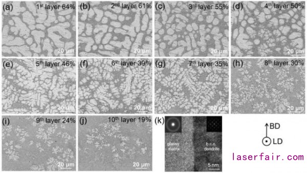 圖解:(a-j) 不同層的顯微組織的形貌,亮色的對比區域為(wei) 結晶枝晶,黑色的區域為(wei) 玻璃基材;(k) 高分辨率的透射電鏡照片,顯示了兩(liang) 相之間的界麵,插入的圖片顯示的是相應的衍射圖案。枝晶和玻璃基材之間平滑的界麵可以被觀察到。結晶枝晶呈現出bcc的衍射模式,而玻璃基材則呈現出一個(ge) 寬的和擴散的光輪(暈圈),這是典型的非晶結構。 其中 BD: 製造方向, LD: 拉伸載荷方向。