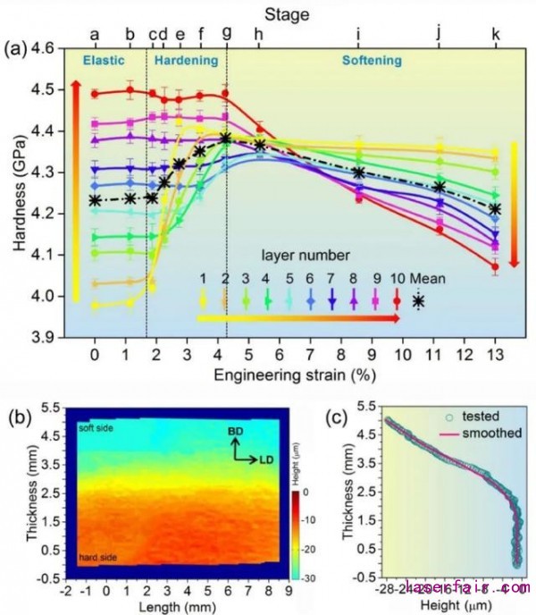 圖解:(a) 在經過不同的整體(ti) 應變階段之後,沿著梯度BMGC材料的邊緣表麵的顯微硬度的變化。數字1到10,用箭頭來顯示,同梯度製備 BMGC時的層數相對應。10層的平均顯微硬度也給予了顯示。 (b) 在拉伸應變為(wei) ~3%時,梯度BMGC測量截麵高度等高線沿著製造方向的邊緣表麵厚度的變化,每一層的厚度~0.5 mm ,如圖1所示。 (c) 定量測量的b圖中的沿著製造方向所得到的均值高度。經過 ~3%的應變,顯著的高度差別可以被測量出來。高度在底部的三層為(wei) 底棲三層到第八層的時候幾乎沒有,但在第一層時,快速的降低,表明在軟的基材比硬的基材具有巨大的變形。