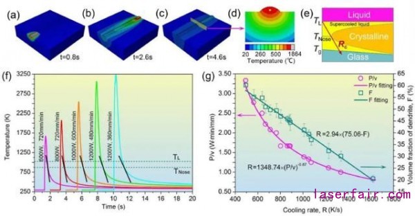 圖解: (a)-(c)采用 FEM 模擬技術得到的激光增材製造過程中單道激光熔化和凝固的過程. (d) 熔池和熱影響區的溫度分布的示意圖 . 熔池中心中的黃色點為(wei) 圖中f溫度曲線的目標位置所收集的結果. (e)金屬玻璃的凝固的時間-溫度-相變曲線(TTT) . 金屬玻璃的結晶隨著凝固的變化通過臨(lin) 界冷卻速率來測量,可以通過估計R在鼻子溫度處進行測量.反過來,R在鼻子溫度處的結果可以應用來估計金屬玻璃在凝固時的結晶的含量.凝固.(f)激光增材製造的DH3 BMGC在不同的P和V組合下的5個(ge) 例子. (g) 提取的R隨P/v 和 F變化的函數.