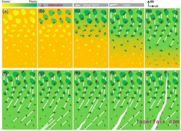 由於(yu) 沒有晶體(ti) 缺陷,諸如位錯,晶界等,塊體(ti) 金屬玻璃(bulk metallic glasses (BMGs))呈現出高強度和彈性配以塑性加工性。塊體(ti) 金屬玻璃的廣泛大量的應用卻受到了在室溫下塑性差的限製,尤其是在拉緊應力的條件下。對於(yu) 區域應力,塑性應變也高度的本地化為(wei) 主要的剪切帶,該剪切帶快速的擴展和導致了塊體(ti) 金屬玻璃的嚴(yan) 重損壞。為(wei) 了克服這一限製,二次相也經常通過原位的引入堅硬的塊體(ti) 金屬玻璃基材中,並形成一種稱之為(wei) 塊體(ti) 金屬玻璃基材複合材料。這些分散的軟的枝晶促進多個(ge) 剪切帶的成核,阻礙了剪切帶的快速發展進入到裂紋,並且相應地提高其韌性。