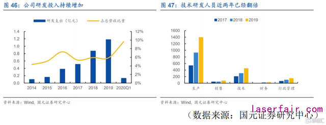 激光器作為(wei) 技術密集型行業(ye) ,橫跨多個(ge) 學科,激光器研發技術難度較高,因此研發費用的投入以及研發人員的數量是公司可以保持持續競爭(zheng) 力的關(guan) 鍵。2019年研發投入1.18億(yi) 元,同比增長35.63%;2019年技術人員相比2017年人數已經翻倍。