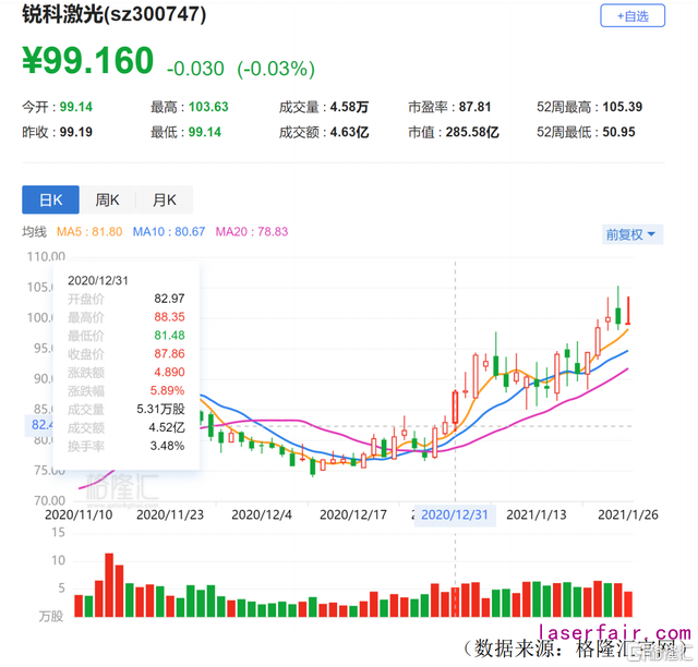 2020年12月31日,公司發布首期股權激勵計劃(草案)、長期股權激勵計劃(草案)。銳科激光從(cong) 發布公告以來,截止2021年1月26日,股價(jia) 上漲12.86%。