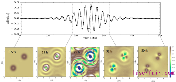 圖2.激光輻照下MgF2晶體(ti) 中的電子動力學。上圖為(wei) 激光場的波形,下圖為(wei) 不同時刻電子密度分布的變化