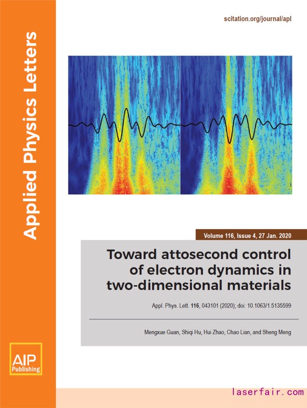 圖4.Appl. Phys. Lett.封麵。圖中展示的是二維固體(ti) 在相位差分別為(wei) π/2和π的雙激光脈衝(chong) 下(黑線)的輻射譜隨時間的變化