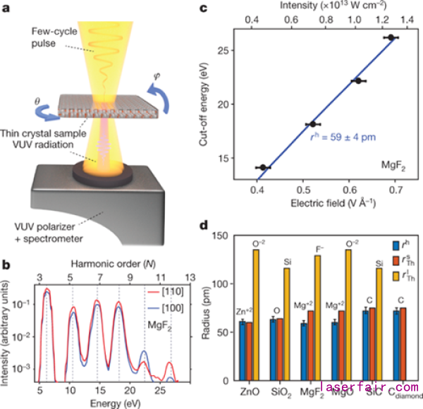 圖1.固體(ti) 價(jia) 電子的激光顯微照相術。(a)是實驗裝置圖,(b)是MgF2晶體(ti) 的高次諧波譜,(c)是高次諧波截止頻率與(yu) 激光場的關(guan) 係,其斜率即對應於(yu) 體(ti) 係中的最小離子半徑,(d)探測到的不同原子或離子的半徑(藍色)和經驗值(紅色、黃色)的比較