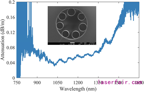 圖1 反諧振空芯光纖傳(chuan) 輸損耗測量圖(插圖為(wei) 反諧振空芯光纖電鏡圖)