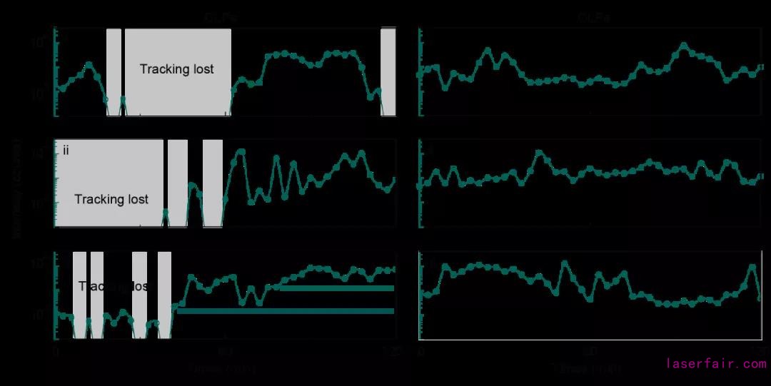 圖3. 在細胞追蹤過程中激光顆粒的強度信號變化。對運動的Hela活細胞內(nei) 的傳(chuan) 統型激光顆粒(CLP)和全方位出射型激光顆粒(OLP)進行實時監測,得到的微盤腔顆粒的激光信號變化。數據顯示CLP由於(yu) 頻繁的激光信號丟(diu) 失導致細胞追蹤失敗,OLP能夠實現高信噪比單細胞連續追蹤。