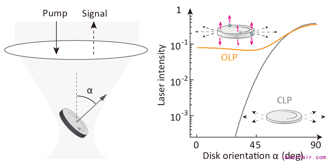 圖2. 回音壁模式微盤腔的激光輸出空間分布調控。激光顆粒泵浦激發和激光收集示意圖(左)。傳(chuan) 統微盤腔(CLP)以及全方位出射型微盤腔(OLP)的激光強度隨微盤腔取向角的變化。全方位出射型激光顆粒是通過在微盤腔表麵引入彈性散射(邊緣缺陷或者納米顆粒)實現。