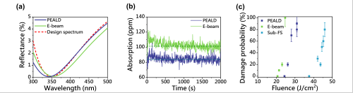 圖2 等離子體(ti) 增強原子層沉積(PEALD)和電子束沉積(E-beam)減反射薄膜的性能對比。(a)反射光譜,(b)膜層吸收,(c)激光損傷(shang) 概率。