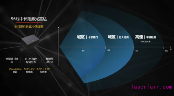 華為(wei) 2020年12月21日發布的MEMS混合固態激光雷達,采用905nm激光器,分辨率為(wei) 96線,擁有全視場景150米的測距能力,大視野120°x 25°,滿足城區、高速等場景的人、車測距需求;全視野中,水平、垂直線束均勻分布,不存在拚接、抖動等情況,形成穩定的點雲(yun) 對後端感知算法友好;小體(ti) 積,滿足前裝量產(chan) 車型需求。