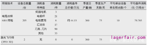 表2 電阻點焊、激光飛行焊備件消耗對比