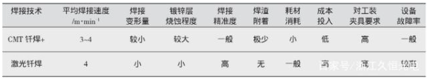 下麵將分別對比以Fronius公司為(wei) 代表研發的CMT電弧焊、CMT釺焊+與(yu) 激光填絲(si) 熔焊、激光釺焊的工藝及性能,如表3、表4 所示。