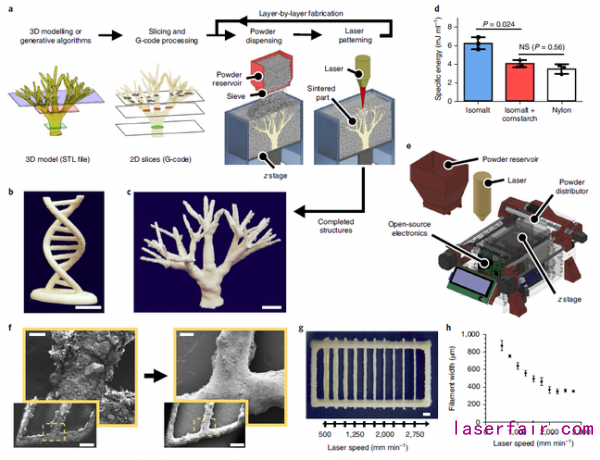 實驗中使用的是糖犧牲材料的基礎成分是異麥芽粉(Isomalt powder),但是異麥芽粉與(yu) 標準激光燒結材料(如尼龍)相比具有更高的粘性(圖1d),需混合抗凝結劑(二氧化矽,玉米澱粉和黃原膠)以稀釋其粘性。然後糖粉末由粉末分裝器和振動篩槽均勻地噴灑在指定區域,通過激光燒結構築成型(圖1a)。所構建的糖支架具有異質3D分支,曲率光滑和無支撐幾何體(ti) 的特性(圖1b)。該支架同時具有一定的硬度和脆性,其彈性模量約為(wei) 600MPa,足以支撐其自身重量並完成後續的水凝膠灌注。該團隊還更新了OpenSLS的硬件和固件,使其能編碼區域特定的燒結參數,更適合進行糖粉的激光燒結(圖1e)。