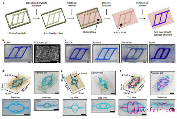 為(wei) 驗證燒結並光滑處理後的糖材料具有犧牲性,該團隊通過燒結製作簡單的網格結構,然後用不同的材料包裹網格結構。在外殼材料凝固後,加水或者PBS溶解糖材料。結果表明,糖材料可被PDMS、PCL、PEGDA、瓊脂、絲(si) 素蛋白、纖維蛋白等多種材料或水凝膠包裹,並且溶解後的管道均有良好的連通性(圖2a - 圖2c)。然後該團隊製造嚐試構建複雜的拓撲結構,在可控性較差的瓊脂材料中分別成功構建了二維多通道、三維分層通道和三維獨立通道等複雜結構。以上實驗說明了基於(yu) 糖粉末的激光燒結技術具有在多種水凝膠中構建複雜血管通道的可能。