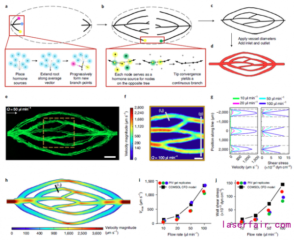 為(wei) 模擬生理條件下的動脈-靜脈血管網絡,該團隊采用了葉脈分支模型來計算分支血管拓撲結構。簡言之,在一個(ge) 橢圓模型內(nei) 假定兩(liang) 個(ge) 葉脈生長點並假定其隨機延伸(圖3a),當兩(liang) 個(ge) 生長束接近時,它們(men) 的末端分支相互吸引(圖3b)並會(hui) 聚形成閉合網絡(圖3c)。但是網絡管道厚度的計算遵從(cong) Murray定律而獨立於(yu) 葉脈網絡生長步驟(圖3d)。經過對該網絡的流動性評估後發現,該網絡可以有效地將流量分布在所有通道中(圖3e),即分叉的流體(ti) 在分支中呈現出較低的速度,而會(hui) 聚的流體(ti) 獲得速度則是分支速度之和(圖3f)。另外,研究結果表明通道中的最大速度和壁麵剪應力是一致的,證明了整個(ge) 網絡中的流體(ti) 流動是均勻分布的(圖3g)。該團隊還發現通過標準計算流體(ti) 力學(CFD)可模擬上述流動性評估結果,於(yu) 是提出了將CFD用於(yu) 模擬和預測血管流動性的可能。文章作者最後通過檢查三個(ge) 單獨的粒子圖像測速(PIV)實驗,證明了該網絡構建的可重複性(圖3i,圖3j)。