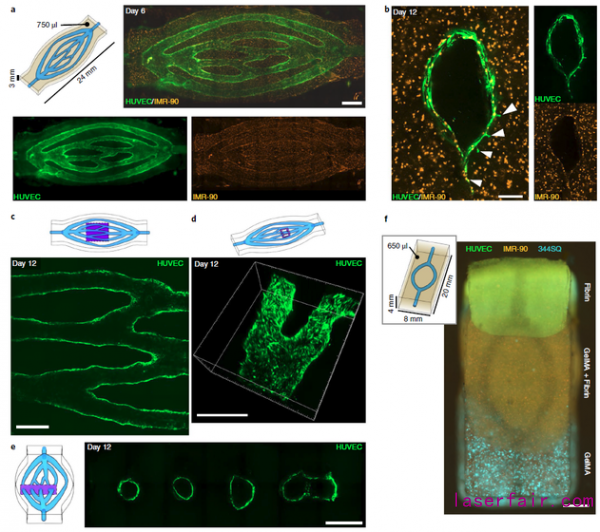在獲得穩定構建血管網狀結構的工藝參數後,該團隊開始進行載細胞實驗。血管網外層水凝膠中混有被mOrange標記的IMR-90成纖維細胞,血管通道內(nei) 皮通過灌注種植GFP標記的內(nei) 皮細胞(HUVEC)。經過11天的灌注培養(yang) 後,結果發現HUVEC在管腔內(nei) 長勢良好,並有向水凝膠內(nei) 萌發的趨勢。進一步的評估表明,HUVEC均勻地覆蓋在網絡的各個(ge) 分支(圖4c,圖4d)和通道的整個(ge) 周長(圖4e)周圍。接下來,該團隊在同一個(ge) 血管網糖支架上的不同區域用不同的水凝膠包裹,構建出一個(ge) 液體(ti) 互通的異源材料血管網組織模型,證明了糖支架激光燒結技術在構建不同組織交界麵模型的潛力(圖4f)。