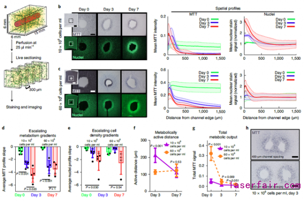 為(wei) 深入了解灌注水凝膠中不同細胞密度下的代謝活性,該團隊通過激光燒結技術製造單管道水凝膠(圖5a)。水凝膠中混合不同密度的HepG2肝細胞,在第0天、第3天、第7天後通過MTT染色研究細胞代謝活性。結果發現,靠近單管道的細胞一直維持較高的代謝活性而其他區域的代謝活性從(cong) 第3天開始減弱(圖5b,c)。對低細胞密度水凝膠的研究顯示,從(cong) 第3天開始管道附近的細胞密度、代謝活性(圖5d,圖5e)開始加速上升,而高細胞密度水凝膠中第3天和第7天的細胞密度沒有顯著變化,可能原因是水凝膠中細胞密度過高而很快達到飽和。同時第7天的結果還表明,在不同細胞密度的水凝膠中其代謝活性半徑和總代謝水平隨著時間的推移趨於(yu) 相同(圖5f,圖5g),並總結了細胞活性與(yu) 通道距離之間的簡單函數關(guan) 係(圖5h)。