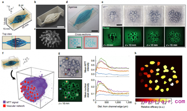 該團隊同樣通過燒結技術構建樹突狀血管網支架並包埋於(yu) 2%瓊脂糖膠中,並驗證了該結構的通道流動性(圖6a – 圖6d)。然後,將該支架包埋於(yu) 載HepG2細胞的水凝膠中,觀察到3天後樹突狀網絡周圍細胞代謝活性增強(圖6e)。該團隊進一步開發了一個(ge) 圖像處理工作流程,將整個(ge) 凝膠的代謝活動進行可視化,並發現樹突狀血管網存在灌注不充分的區域。其可能原因是該區域上遊管道本身灌注不足導致的(圖6f – 圖6h)。
