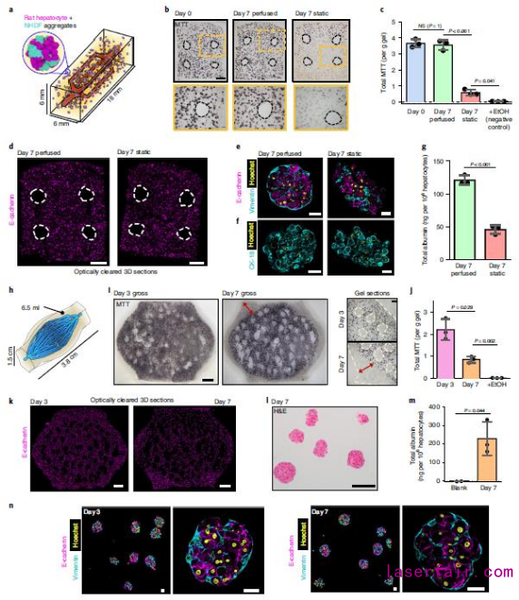 首先,該團隊製作簡單的多通道水凝膠,水凝膠中植入小鼠原代肝細胞。相比於(yu) 靜態培養(yang) ,通過灌注培養(yang) 的原代肝細胞維持更高的代謝活性和更真實的蛋白表達,細胞之間的間隙也更為(wei) 緊密,同時也表達更高的白蛋白水平(圖7a-圖7g)。然後,該團隊製作了1.5cmx 3.8cm大尺度樹突狀網絡培養(yang) 小鼠原代肝細胞(圖h)。結果發現肝細胞主要聚集在管道周圍生長(圖7i,圖7j),這些細胞在培養(yang) 7天後細胞仍然維持白蛋白分泌功能和緊密的團簇結構(圖7l – 圖7n)。進一步分析發現該團簇代謝活性在培養(yang) 3天達到最高,培養(yang) 7天後出現明顯下降。同時E-cadherin表達檢測也證實了代謝的變化(圖7j,圖7k)。