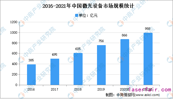 目前,我國已成為(wei) 全球製造業(ye) 第一大國,國內(nei) 市場對激光技術產(chan) 品的需求日益旺盛。2010年以來,得益於(yu) 激光加工應用市場的不斷拓展,我國激光產(chan) 業(ye) 也逐漸駛入高速發展期。2018年fun88官网平台設備市場規模達到605億(yi) 元,同比增長22.22%,2011年至2018年複合增速達26.45%。中商產(chan) 業(ye) 研究院預測,2021年我國激光設備市場規模將達988億(yi) 元。