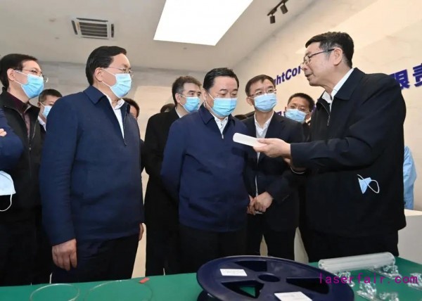 郝鵬一行走進武漢光穀航天三江激光產(chan) 業(ye) 技術研究院有限公司、睿芯特種光纖等生產(chan) 車間調研,詳細了解產(chan) 品在航天航空、3D打印、汽車製造等領域的應用。郝鵬說:要持續提升自主創新能力,力爭(zheng) 在關(guan) 鍵核心技術上取得突破,助力科技自立自強;進一步整合資源,加快國產(chan) 核心技術應用,加快形成產(chan) 業(ye) 鏈上下遊合力。