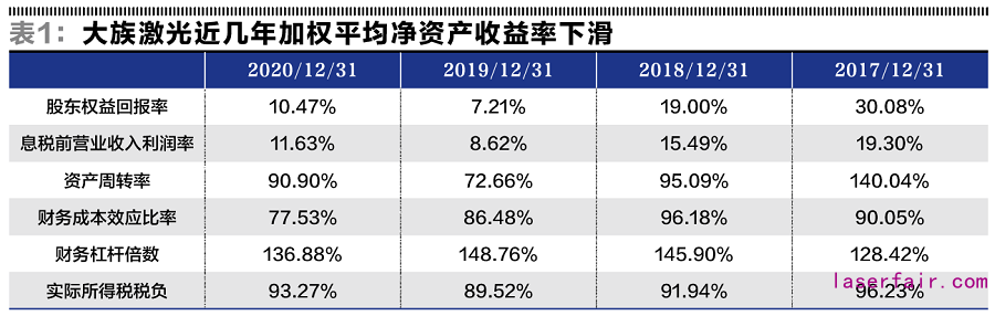 然而,與(yu) 券商研報和公司年報形成對比的,則是大族激光最近幾年的加權平均淨資產(chan) 收益率的下滑(見表1)。