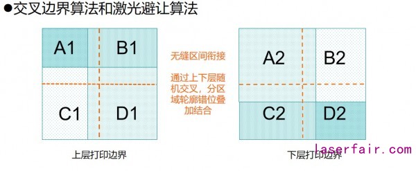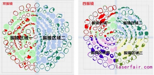 多激光多振鏡設備的核心重點之一,是多束激光並發工作。傾(qing) 向提高打印效率為(wei) 目標的設備和傾(qing) 向打印大幅麵尺寸為(wei) 目標的設備,在路徑規劃掃描控製重點不一樣。前者對軟件算法要求更高。