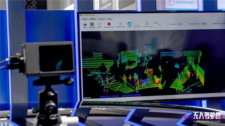 觀眾(zhong) 從(cong) 現場可以直觀看到CH128X1實時演示的點雲(yun) 效果。那麽(me) ,我們(men) 怎麽(me) 判斷雷達的點雲(yun) 成像質量好與(yu) 否呢?其實,激光雷達發射激光出去後,接收回來的每一個(ge) 點會(hui) 向係統輸出一個(ge) x,y,z值,這些點會(hui) 根據x,y,z值還原到坐標係下,精度越高準確度越高,所形成的點雲(yun) 排布越整齊,成像越清晰。CH128X1對展位環境的三維成像邊緣清晰、幹淨整潔沒有噪點,由此可見,其所宣稱的±3cm精度做的一致性是比較高的。從(cong) 整體(ti) 上看,CH128X1的點雲(yun) 幾乎沒有什麽(me) 明顯跳動,可見其穩定性也較高。
