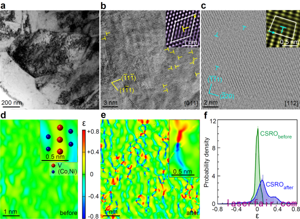 圖3.化學短程有序與(yu) 位錯的交互作用以及拉伸變形前後短程有序區域應變演化