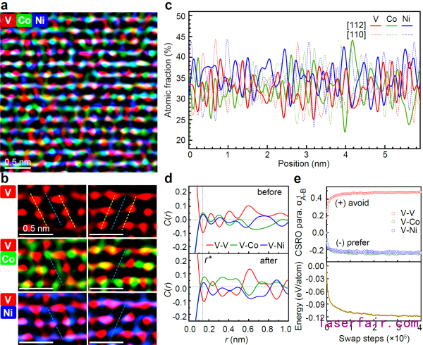 與(yu) 化學無序的傳(chuan) 統合金不同,HEA包含等原子比或近等原子比的多種主要合金元素,不同或相同原子彼此相遇的幾率大,會(hui) 產(chan) 生化學相互作用,原子相互之間傾(qing) 向於(yu) 吸引或排斥,即近鄰原子間有偏好地選擇回避或聚集,會(hui) 形成化學短程有序(chemical short-range order, CSRO),因此,CSRO是高熵合金本征的微結構屬性。CSRO的尺度小,一般在亞(ya) 納米尺度的原子第一近鄰和次近鄰原子層內(nei) ,並對強化、應變硬化和塑性行為(wei) 等力學性能發揮重要作用。然而,直接看到CSRO並非易事,難點在於(yu) CSRO尺度小、組成元素間原子序數相差小和衍射強度太弱。利用透射電子顯微鏡(TEM)技術,學界迄今尚未有清晰證據可信地表明高熵合金CSRO的存在,也不清楚CSRO元素分布特征和原子堆垛構型。