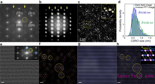 研究人員從(cong) 三方麵觀察並證實了CSRO的存在。首先,在麵心立方VCoNi中熵合金[112]晶帶軸的選區、微區及HAADF高分辨傅氏變換的衍射譜中,均顯示在